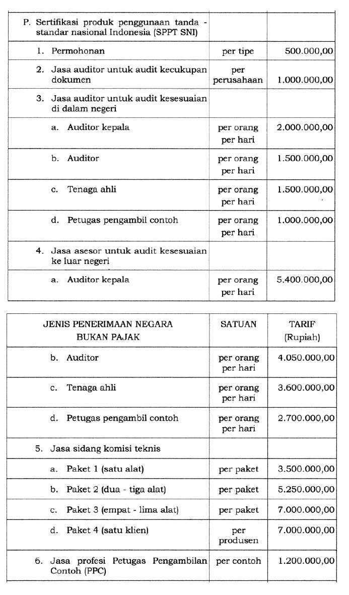 Biaya yang dikenakan berdasarkan PP Tarif RI Nomor 28 Tahun 2023, yaitu pada bagian "Sertifikasi produk penggunaan tanda Standar Nasional Indonesia (SPPT SNI).