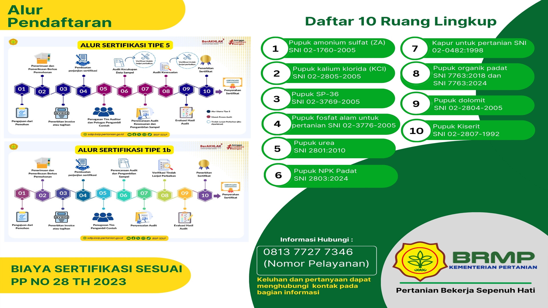 LS Pro BBPM SDLP, Badan Perakitan dan Modernisasi Pertanian melayani jasa sertifikasi pupuk secara mandiri dan tidak diskriminatif serta menjaga kerahasiaan dan menjamin hasil sertifikasi yang didukung oleh personil kompeten dan profesional sehingga dapat memenuhi kepuasan pelanggan.